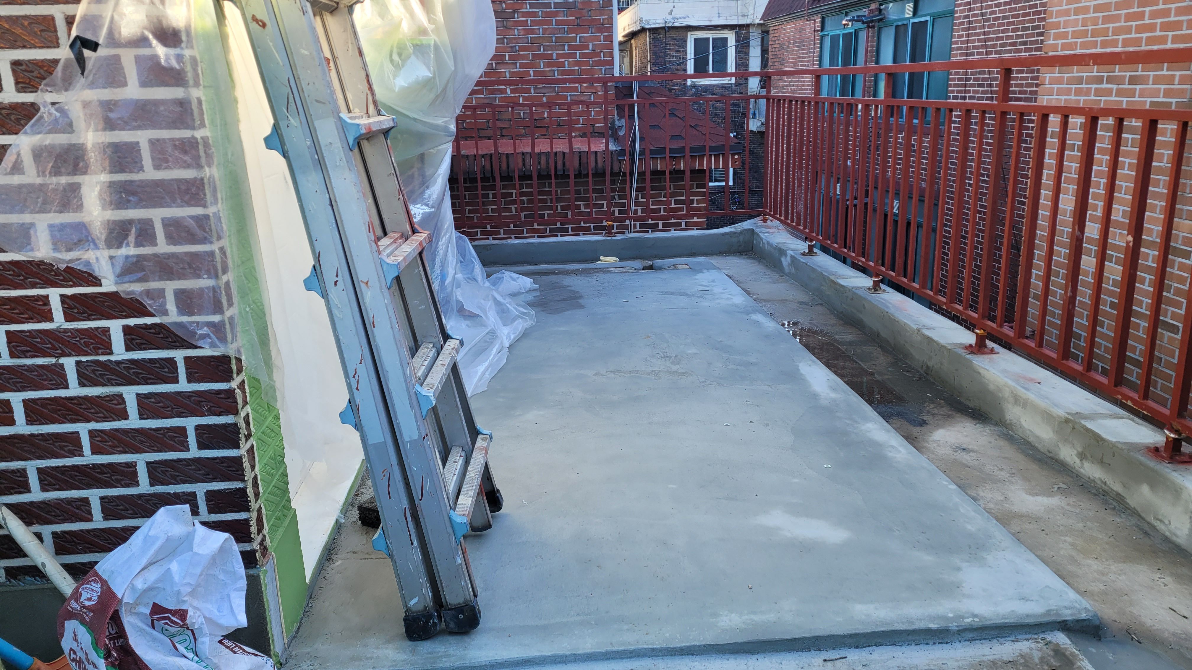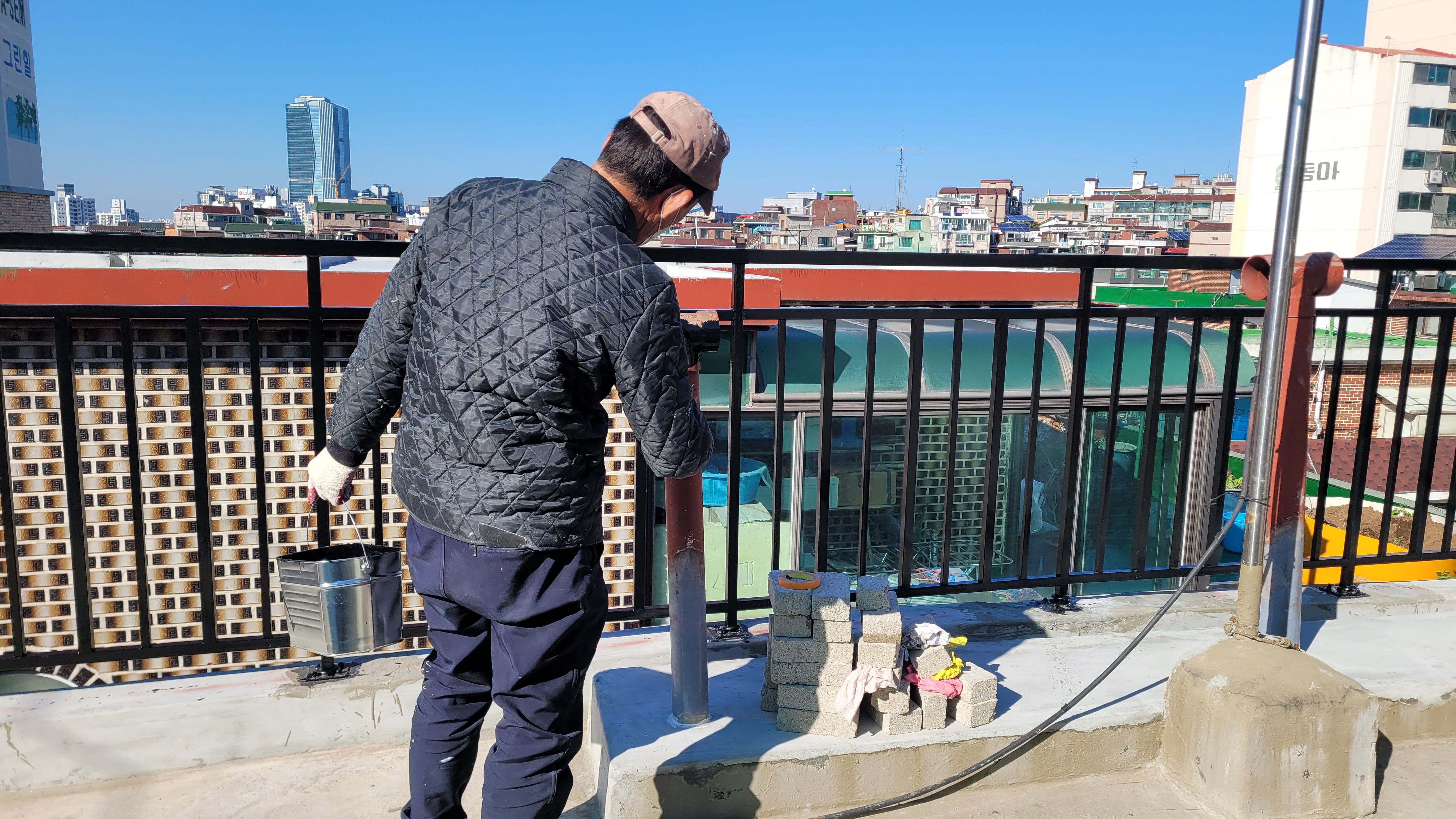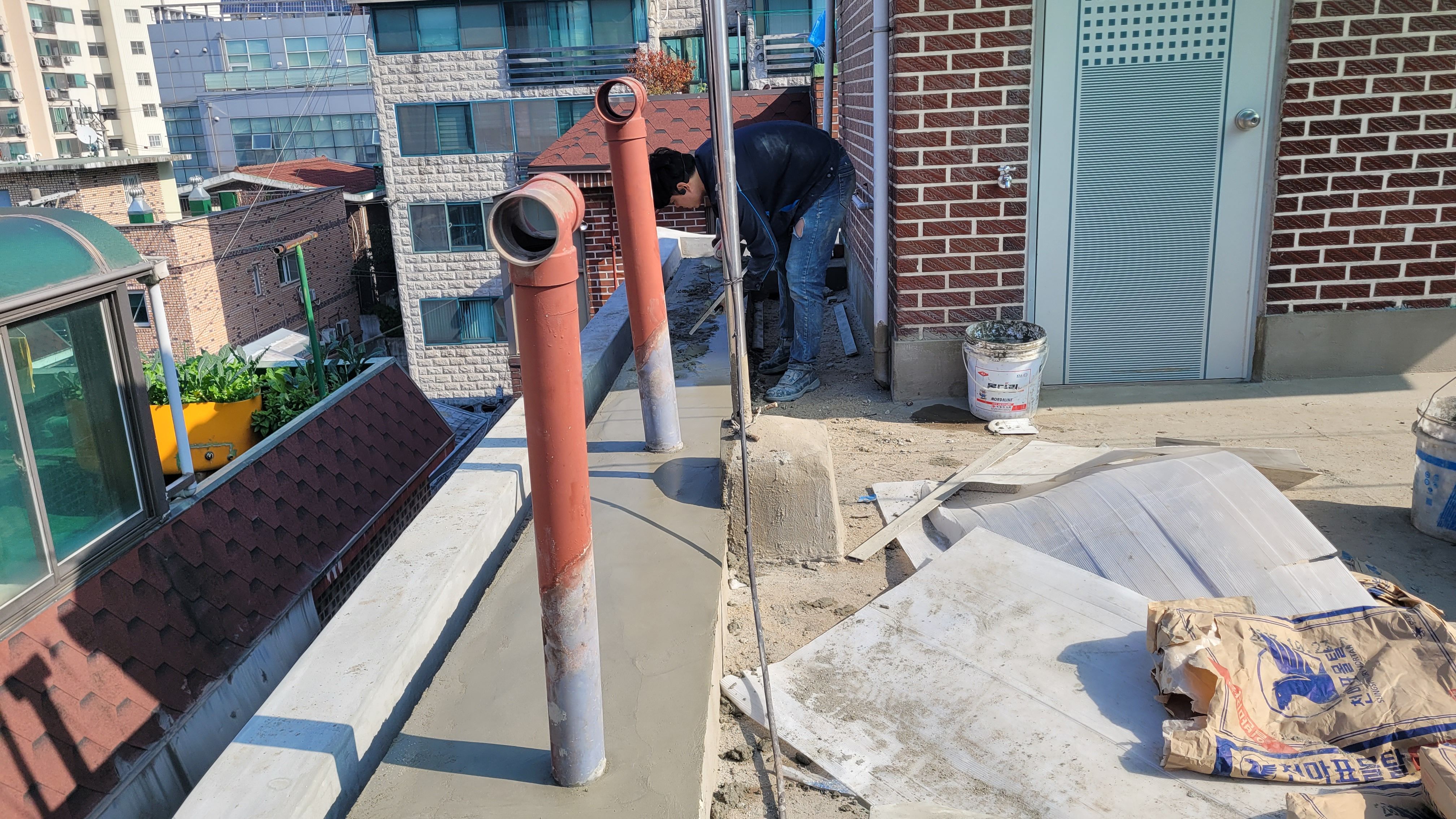 4층 옥상에 눈섭기와로 되어있어서, 이곳을 철거 하고 미장을 한다음, 철 난간대 설치 후 도장을 하고